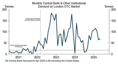 高盛贵金属团队最新报告指出,全球央行和官方机构(不含美国)在今年4月通过伦敦场外市场(OTC)购入黄金68吨,远高于2022年疫情前的月均水平17吨。今年迄今为止,央行的平均月度购金达到了88吨,已经略微超过高盛原先的预测(到2026年中为80吨/月)。