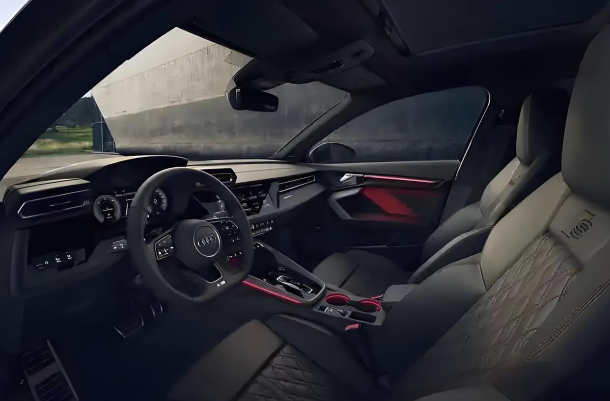 颜值设计层面,全新的奥迪S3前脸的变化微乎其微,依旧是奥迪家族最经典的六边形格栅轮廓,内部黑色中网呈现出交织网状结构,还换上了黑色的四个圈车标Logo,辨识度很高。两侧多边形前大灯加入了黑色的装饰边框,内部的近远光灯均采用LED光源,像素点阵式的光源,配合矩阵式布局,并支持自动转向,照明效果出色,夜间行驶时能清晰显示前方路况,提升安全性。RS运动化前包围采用了三段式设计,两侧多边形导流槽不仅加入了黑色的碳纤维装饰面板,内部还融入了黑色镂空式中网,扁平化的进气口内部分成了三段,再配上纤薄的前唇,也营造出极强的视觉冲击力。尾箱自然上翘,形成了一体式的纤薄的后扰流板,黑色的底部扩散器搭配着双边四出的炮筒式排气,两侧造型犀利的三角形导流槽加入黑色的装饰,内部还有直立式的红色雾灯,全LED尾灯组通过示宽灯与日行灯呼应设计提升辨识度,转向时同侧日行灯亮度自动降低,避免眩目。