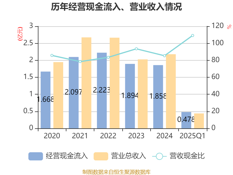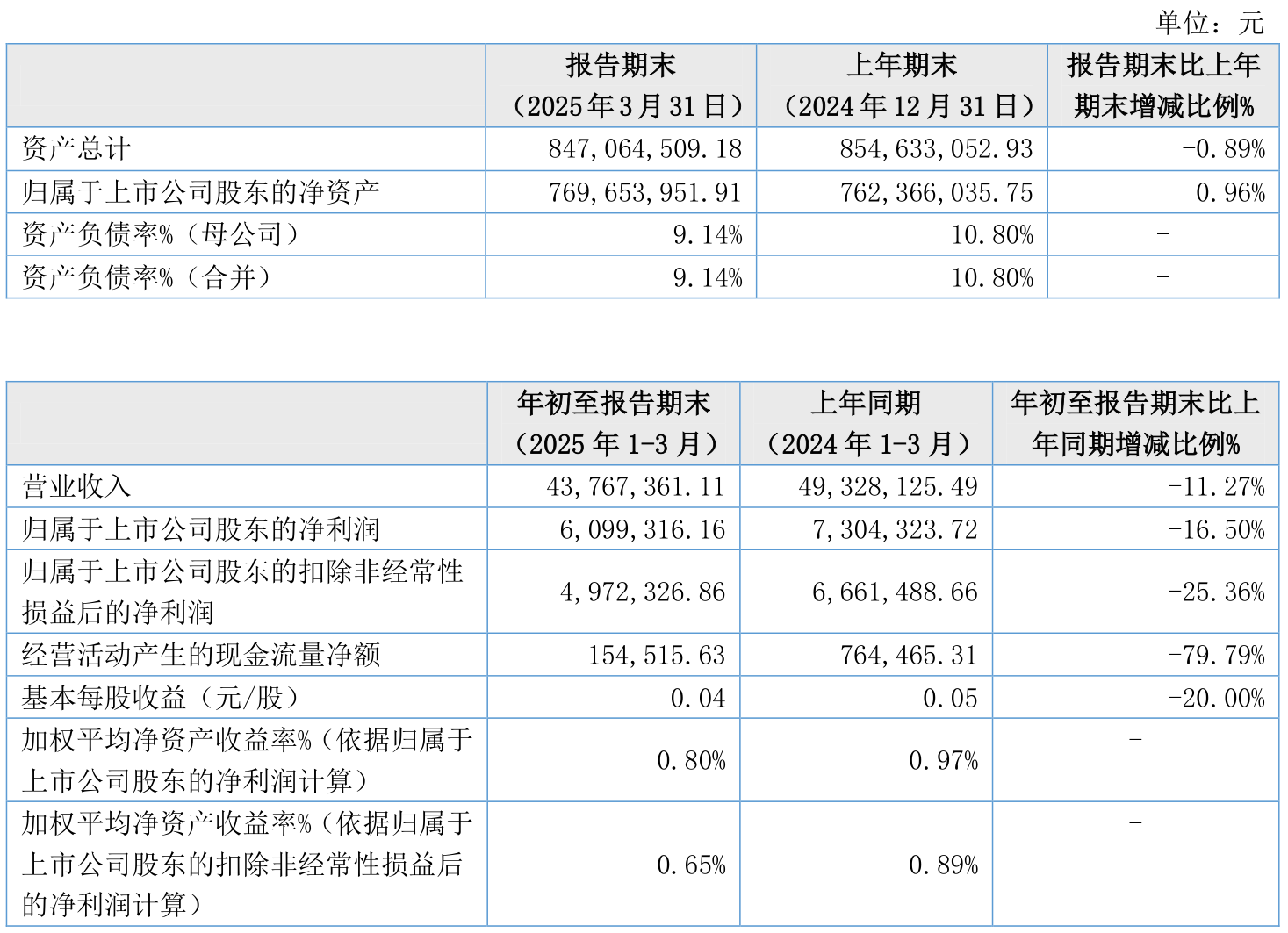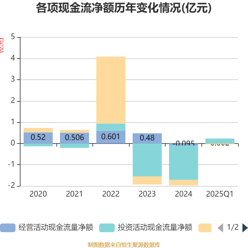 截至2025年一季度末,公司经营活动现金流净额为15.45万元,同比下降79.79%;筹资活动现金流净额-391.22万元,同比减少361.95万元;投资活动现金流净额2307.12万元,上年同期为-6356.76万元。