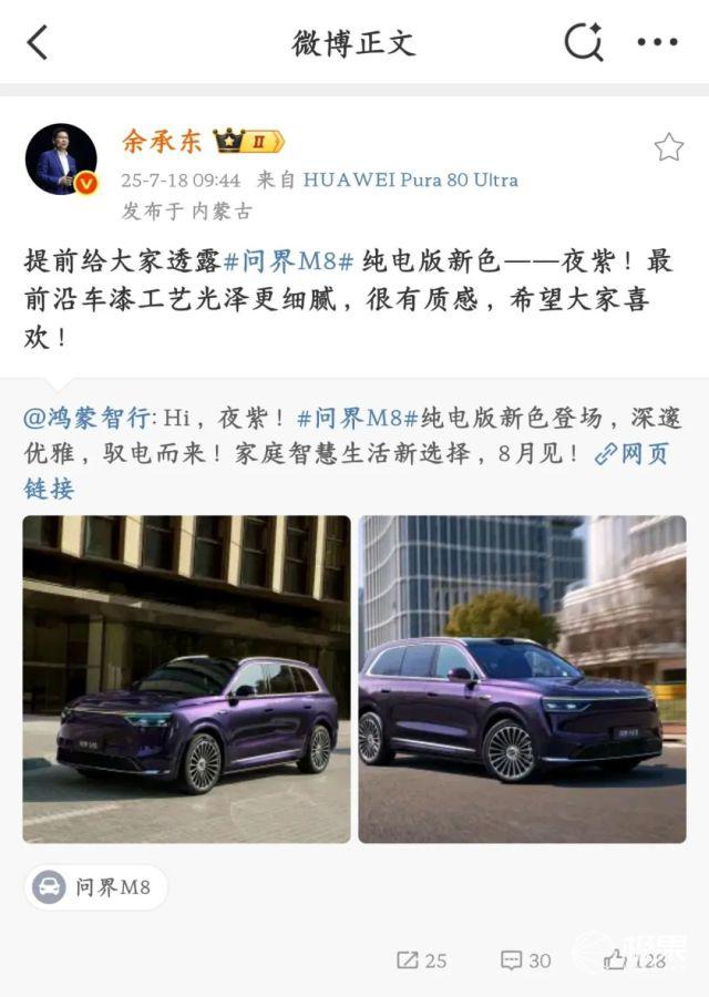 首先是问界 M8 纯电版,目前外观已经完全公布,夜紫色看起来很有质感,计划 8 月份上市。